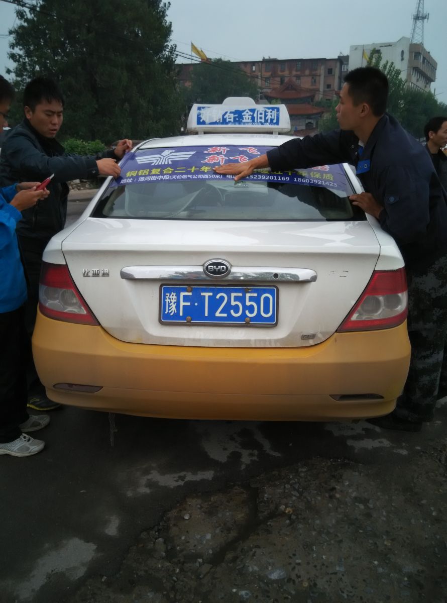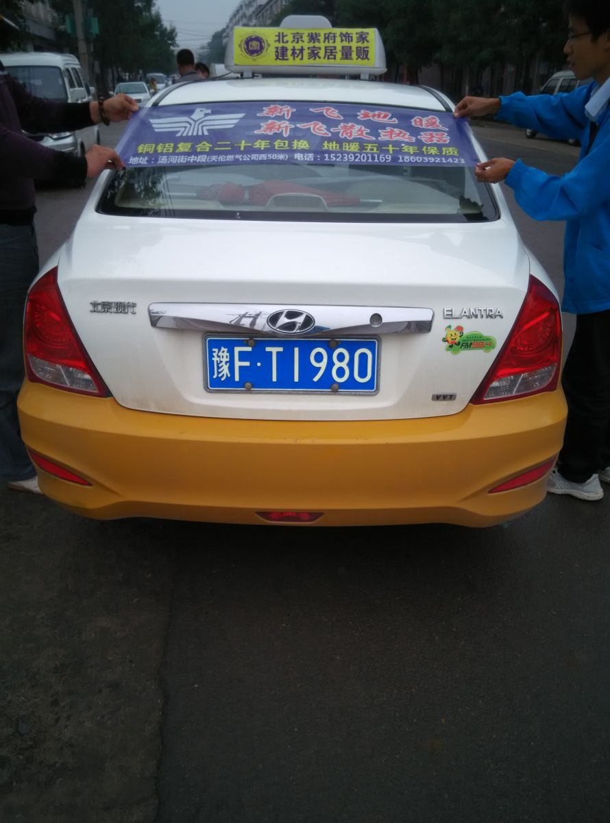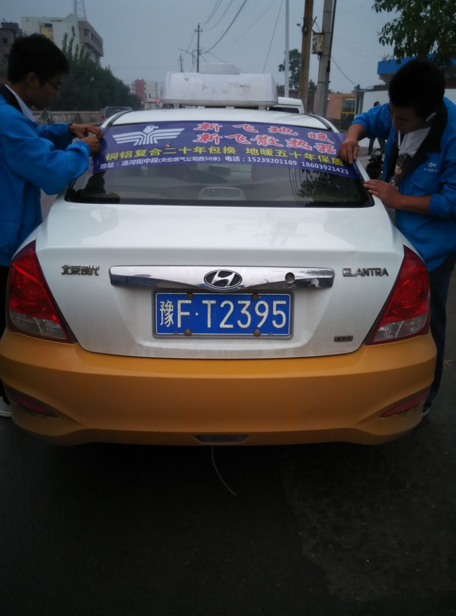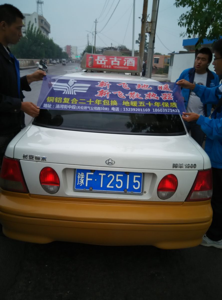 為響應(yīng)新鄉(xiāng)市新飛散熱器有限公司十一優(yōu)惠政策,鶴壁代理商王經(jīng)理在全市舉行團(tuán)購(gòu)簽購(gòu)會(huì),買新飛散熱器抽新飛冰箱大獎(jiǎng),氣氛熱烈,轟動(dòng)全城!為配合公司宣傳,特做百輛出租車廣告。