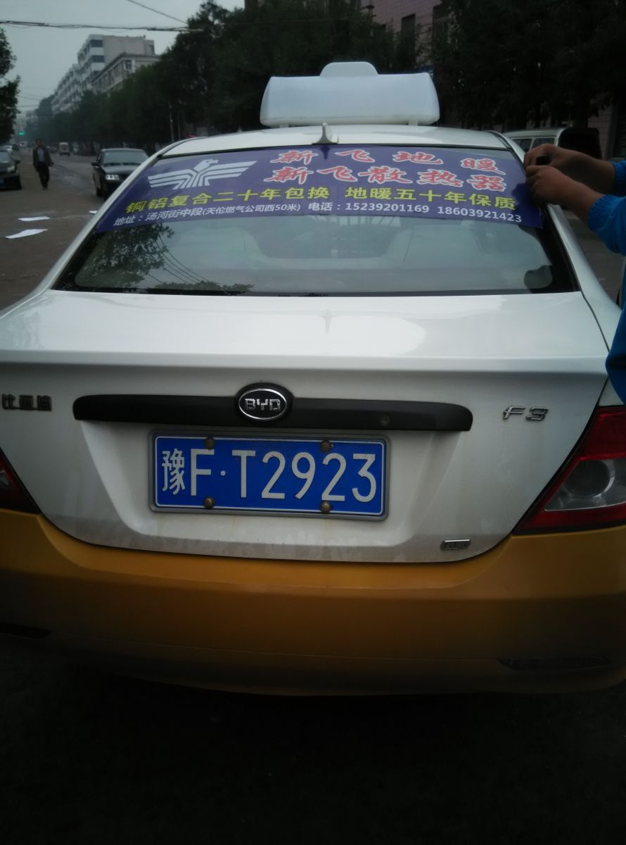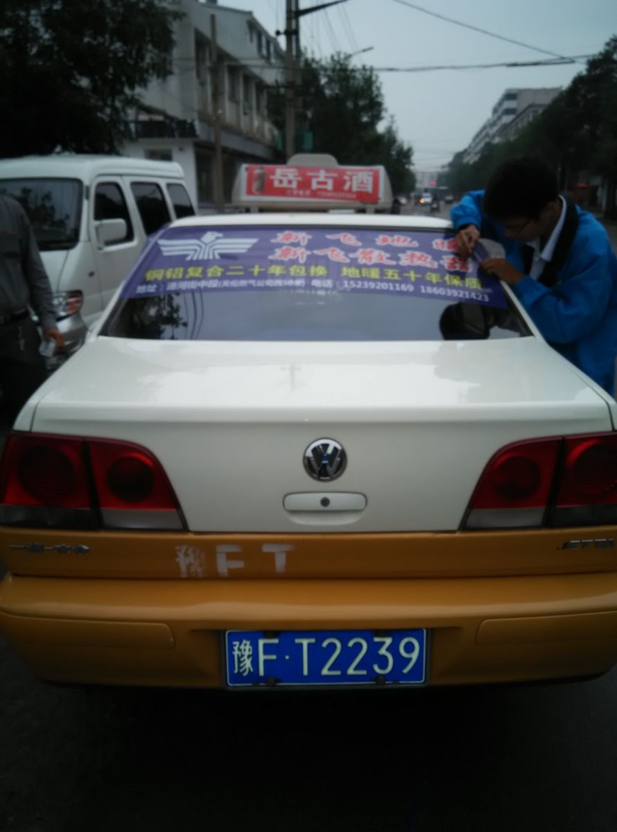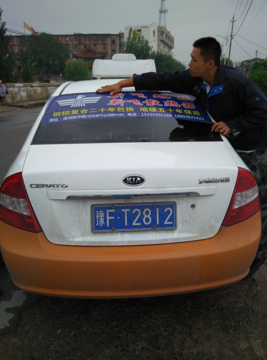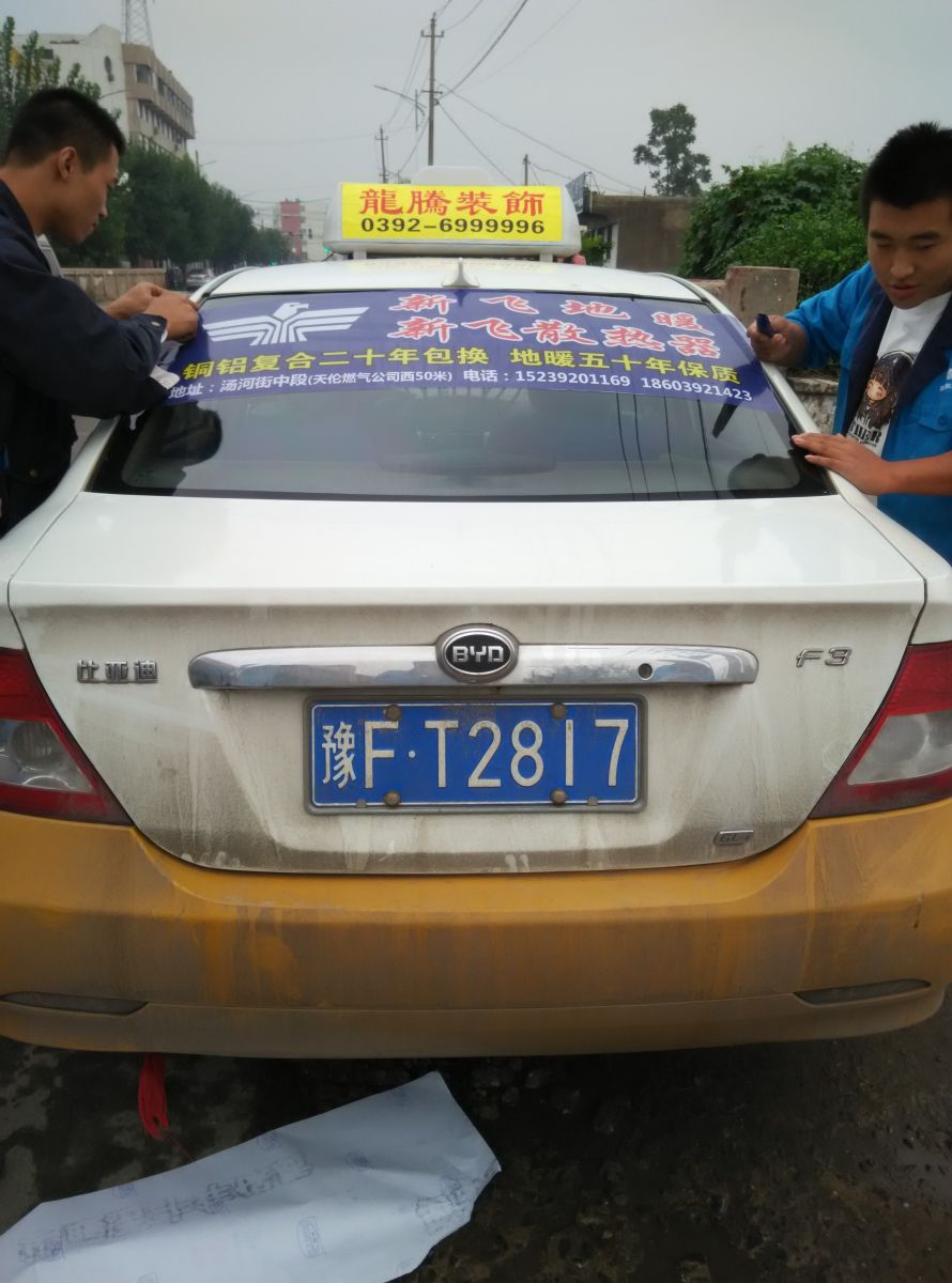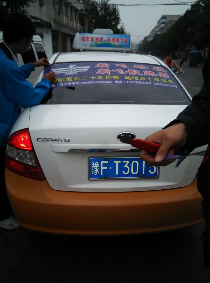 為響應(yīng)新鄉(xiāng)市新飛散熱器有限公司十一優(yōu)惠政策,鶴壁代理商王經(jīng)理在全市舉行團(tuán)購(gòu)簽購(gòu)會(huì),買新飛散熱器抽新飛冰箱大獎(jiǎng),氣氛熱烈,轟動(dòng)全城!為配合公司宣傳,特做百輛出租車廣告。